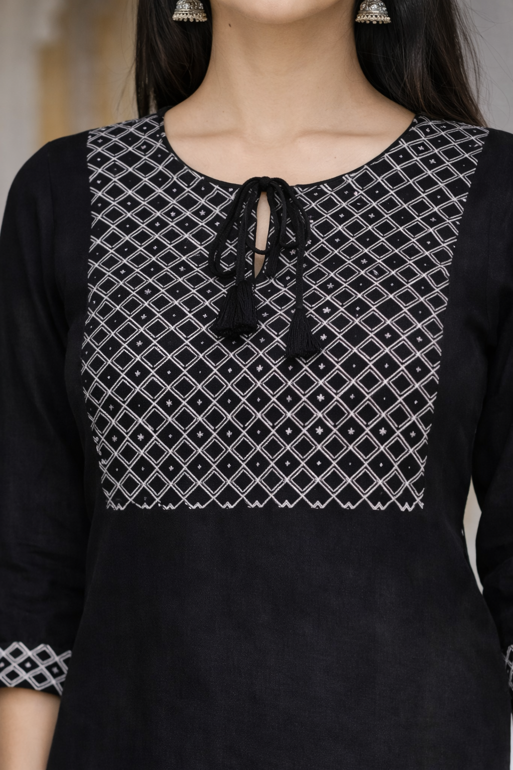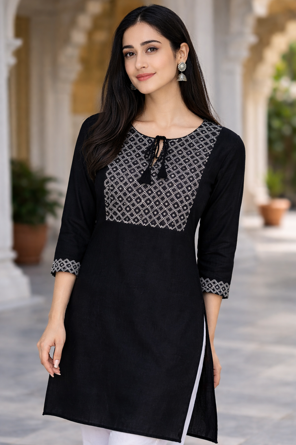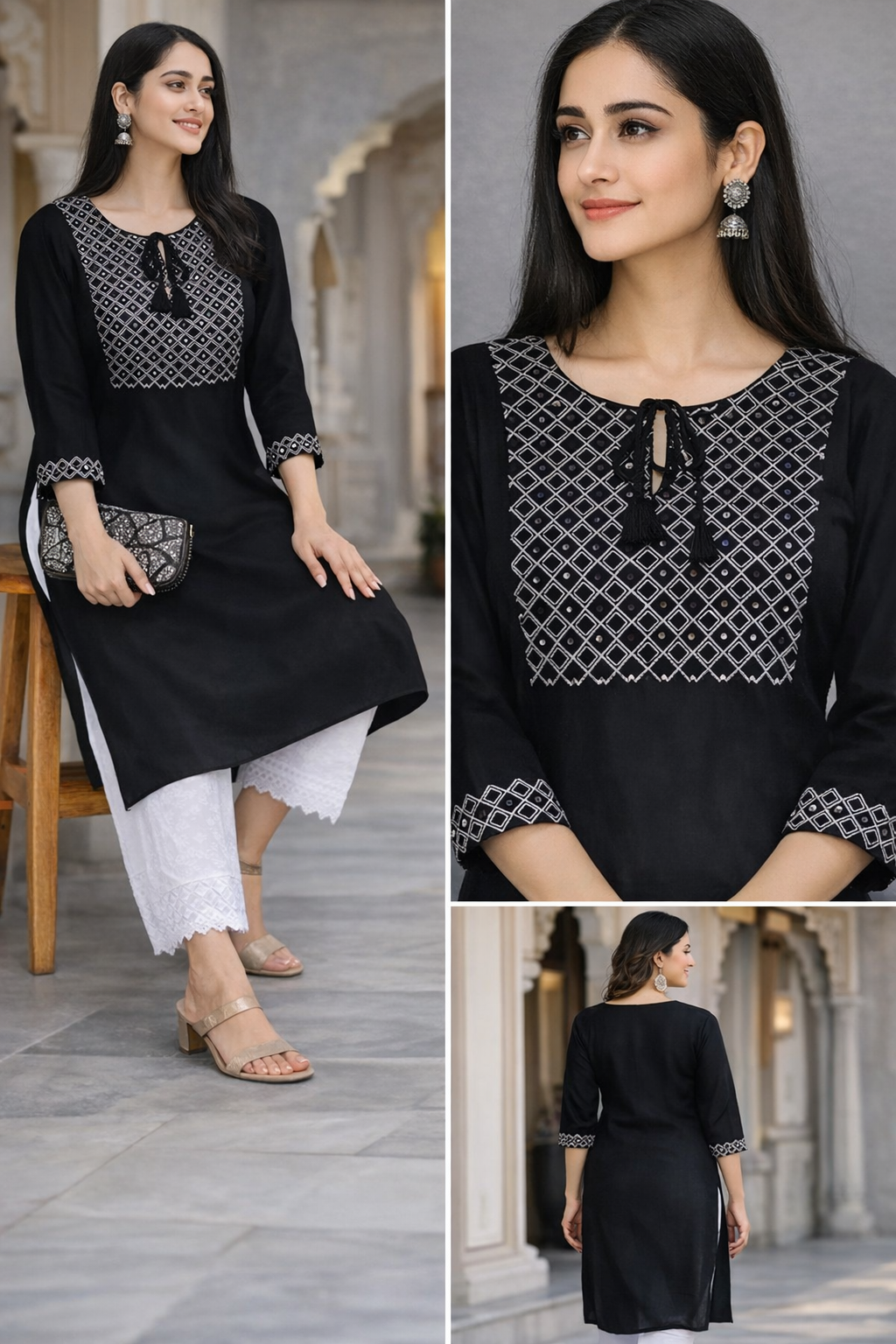 Ye designer black kurti ek single premium piece hai jo modern aur ethnic look ka perfect combo deta hai. Front side par detailed embroidery style pattern diya gaya hai jo outfit ko rich look deta hai. Straight fit aur soft fabric ki wajah se poora din comfortable rehti hai. Leggings, palazzo ya pants ke saath easily pair ho jati hai — office, outing aur festive wear ke liye best choice.