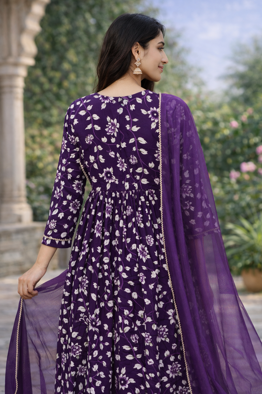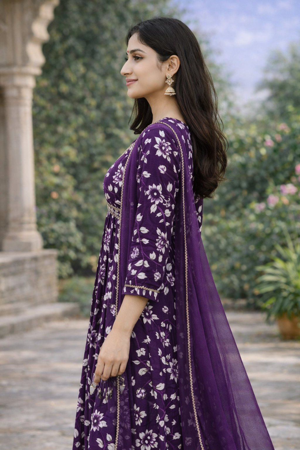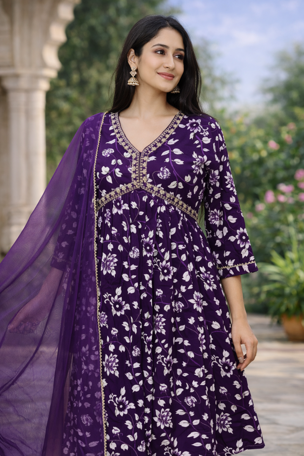 This stylish 3-piece set includes a Flared Kurta, Matching Pants, and Dupatta, perfect for daily wear and small occasions.